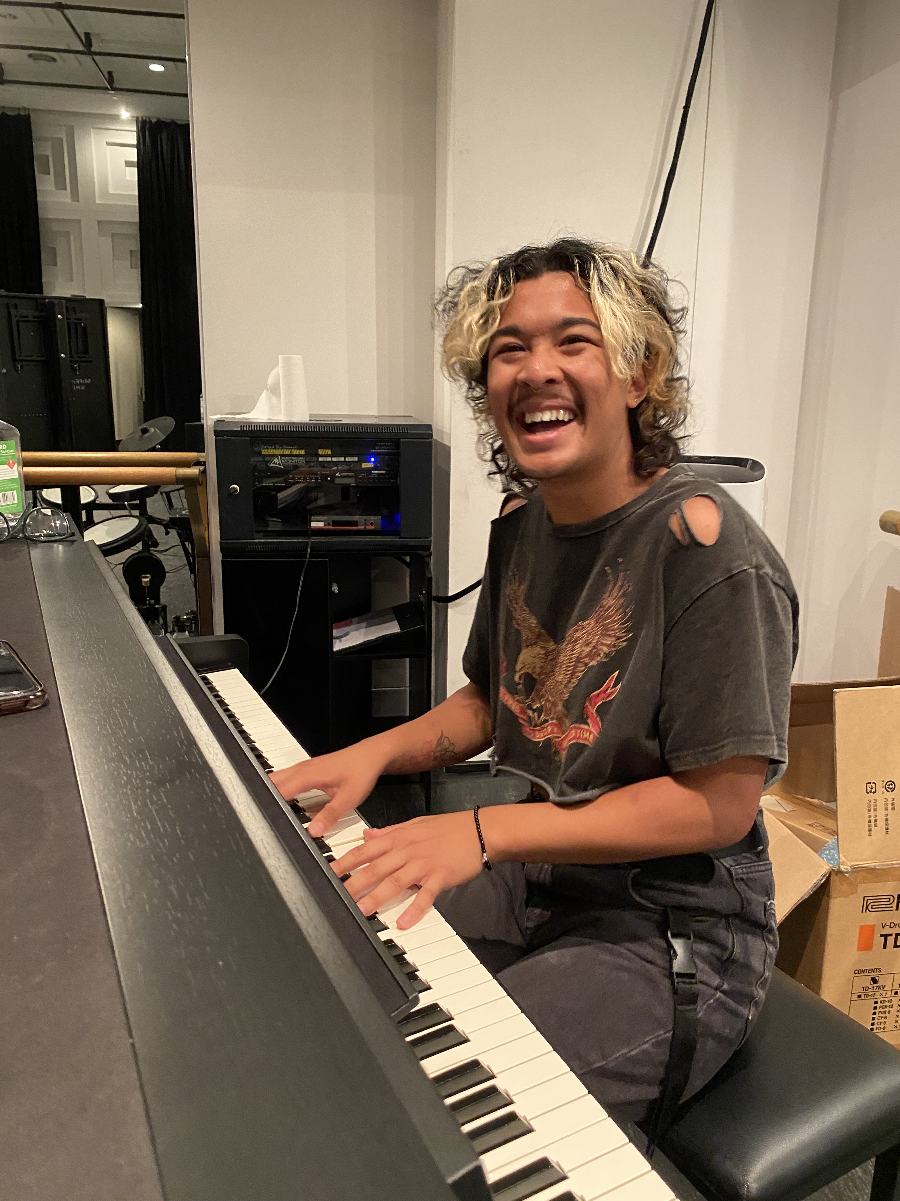 As we walk through QPAC; Sage proudly shows me classrooms that the students use to train and attend classes in. As we’re approaching the studio, we can hear one of Sage’s peers, Chloe singing ‘the Wizard and I, a song from the Wicked musical. There is no denying that her voice is beautiful, or “light with pure clarity,” as Sage describes. The students in QAEMT have incredible talent and dedication which is hardly surprising considering the sheer amount of them who voluntarily come in to practice over the holidays. Once Sage enters it doesn’t take long for the two to mess around with the piano and sing together, something Sage tells me is a regular occurrence.