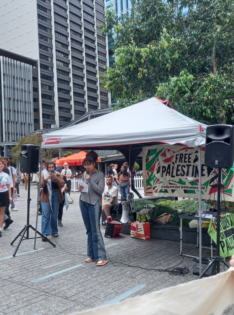 In a speech Griffith Palestinian Student, Islam Qraiqe, recounted experiences of visiting family in Palestine in 2021 and how she and her family had to shelter from Israel attacks. In a brief comment she said she wished Griffith University was more open about discussing Palestinian struggles the same way they speak about Indigenous peoples struggles.