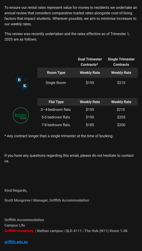 On-campus rental contracts were increased in 2025 to meet budget objectives and to keep up with cost increases. This was a conservative rise, and well below recommendations which were determined through an annual market analysis review process. – Griffith University Spokesperson.